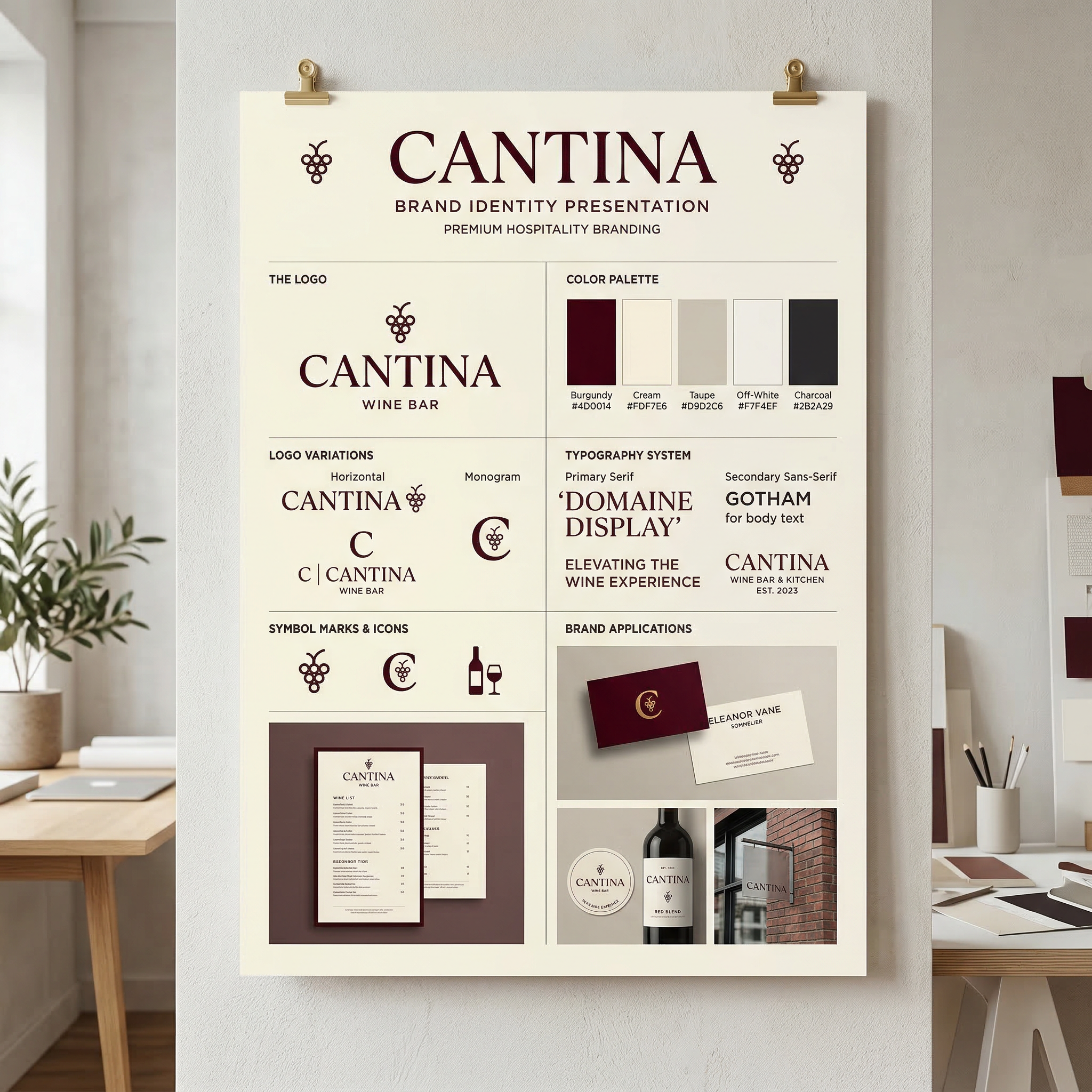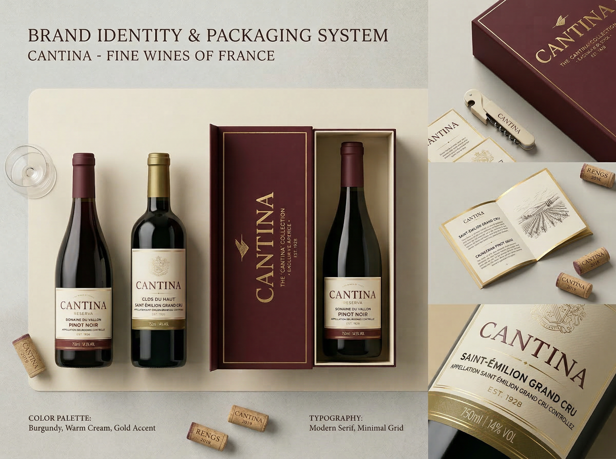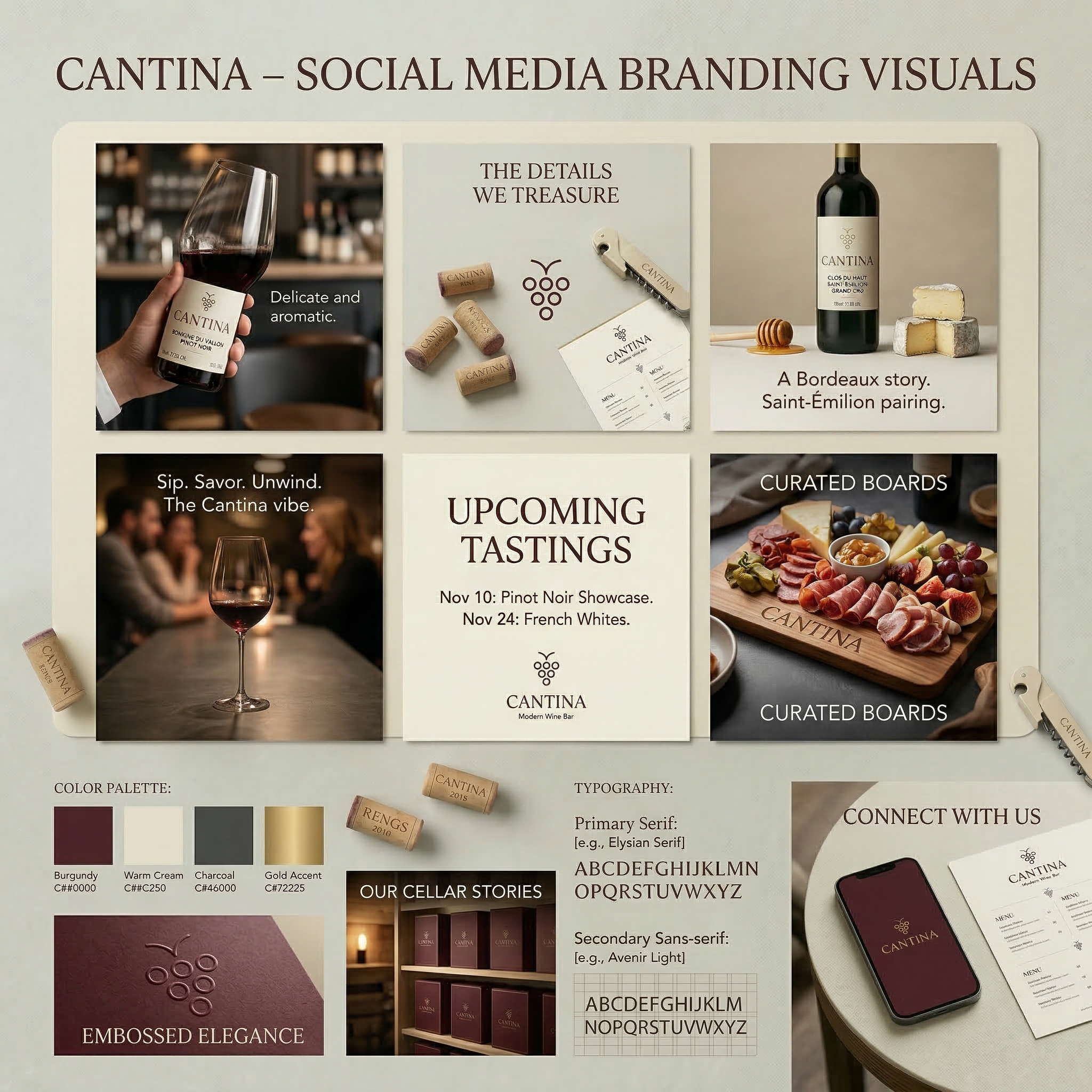Cantina este un concept de brand pentru un wine bar contemporan construit în jurul ideii de social dining și cultură europeană a vinului. Identitatea vizuală combină tipografie elegantă, o paletă cromatică caldă și un sistem grafic minimalist gândit pentru a transmite rafinament, atmosferă și experiență gastronomică.