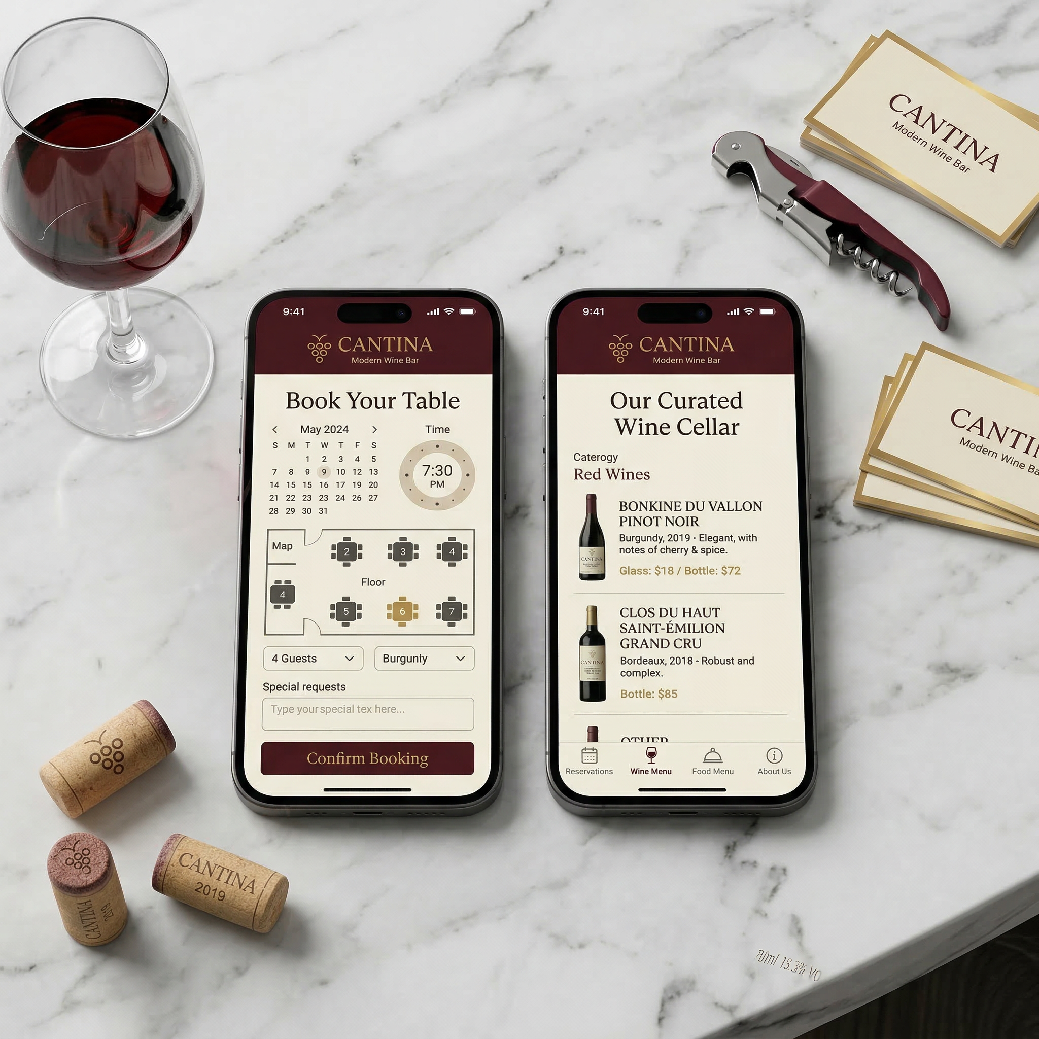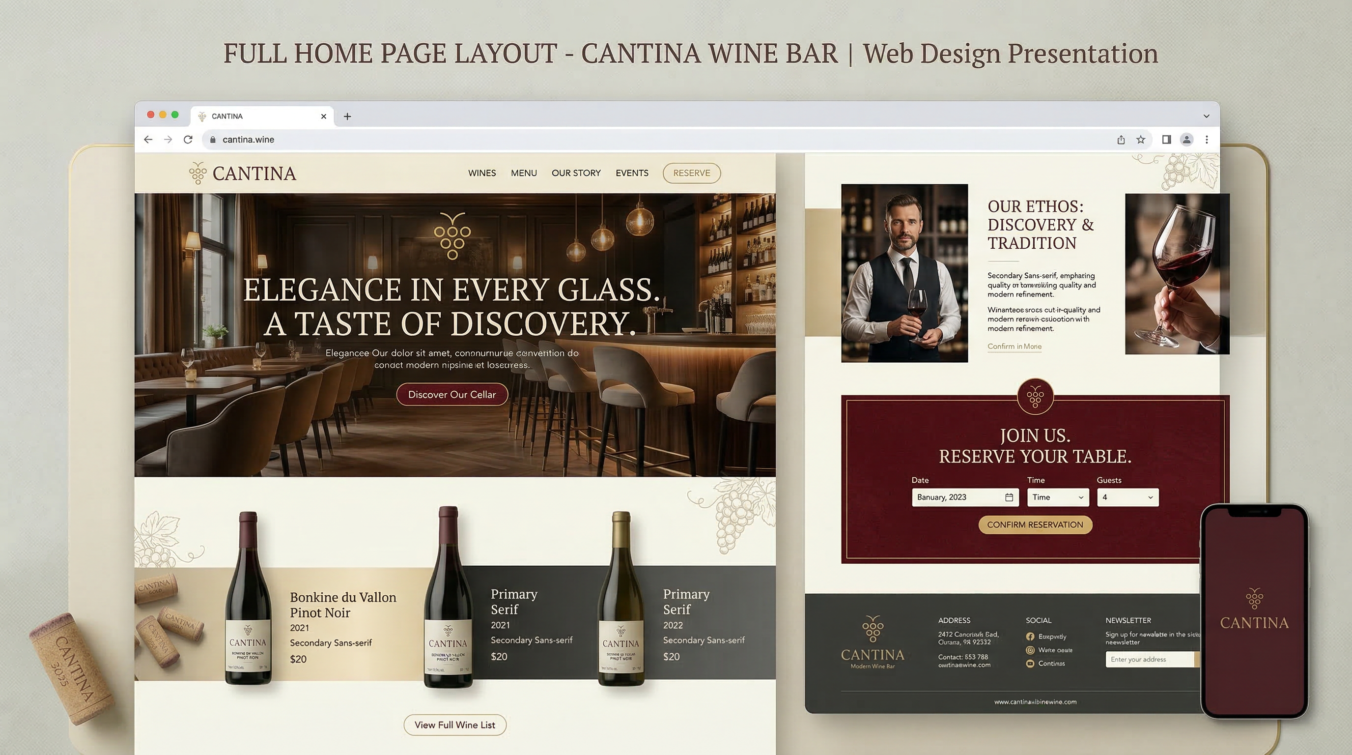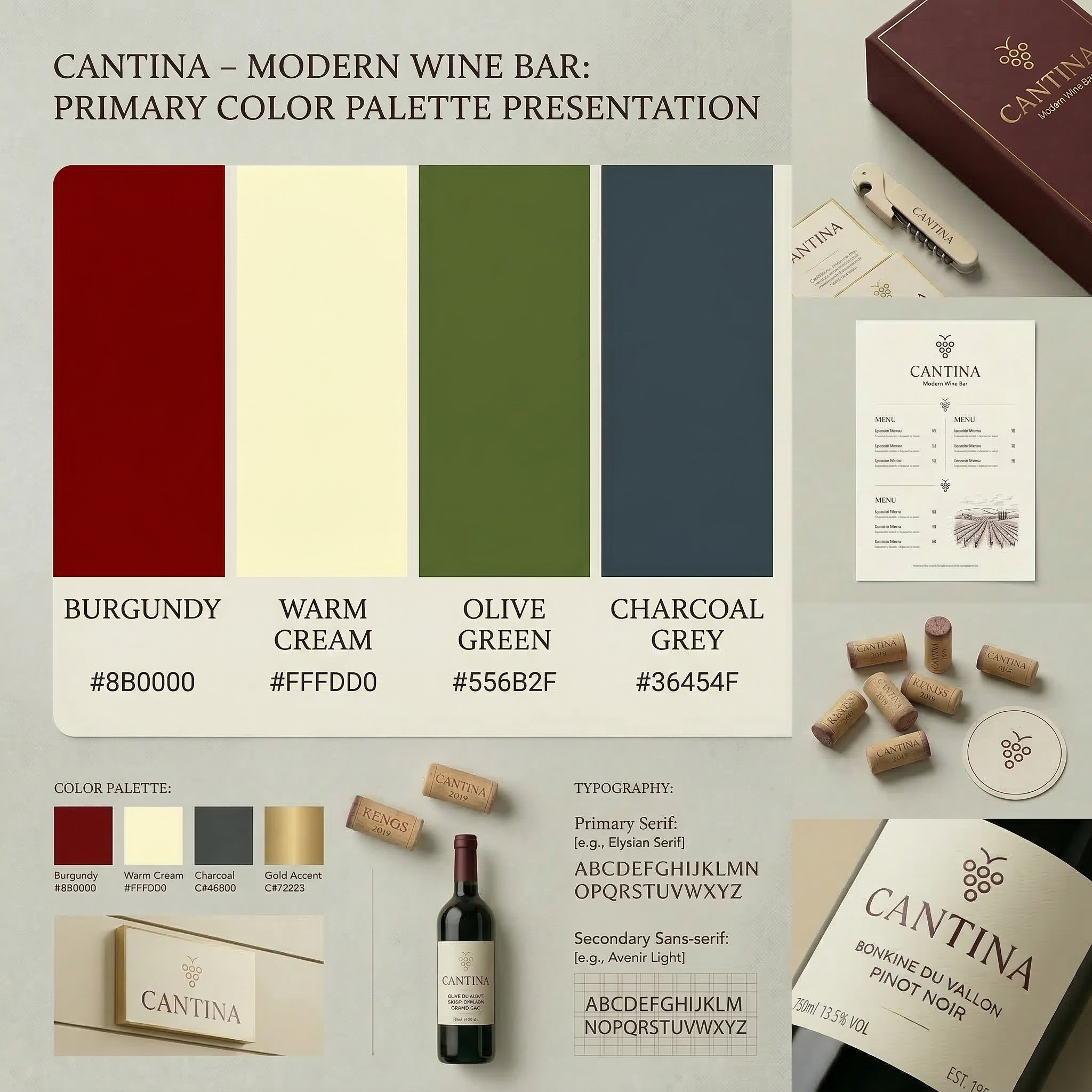 Cantina este un concept de brand pentru un wine bar contemporan construit în jurul ideii de social dining și cultură europeană a vinului. Identitatea vizuală combină tipografie elegantă, o paletă cromatică caldă și un sistem grafic minimalist gândit pentru a transmite rafinament, atmosferă și experiență gastronomică.