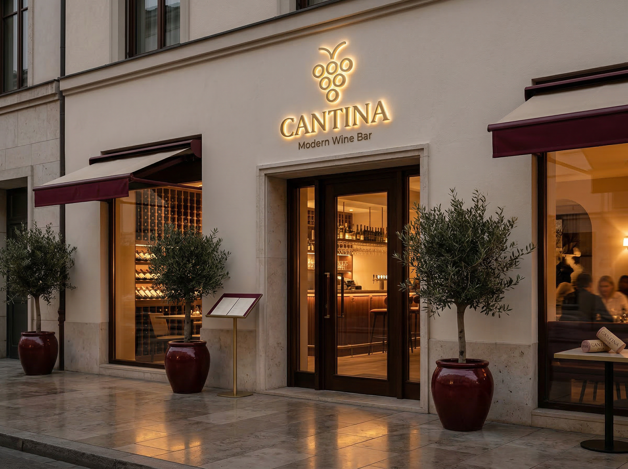 Semnalistica brandului traduce identitatea vizuală în spațiul fizic al wine bar-ului.
