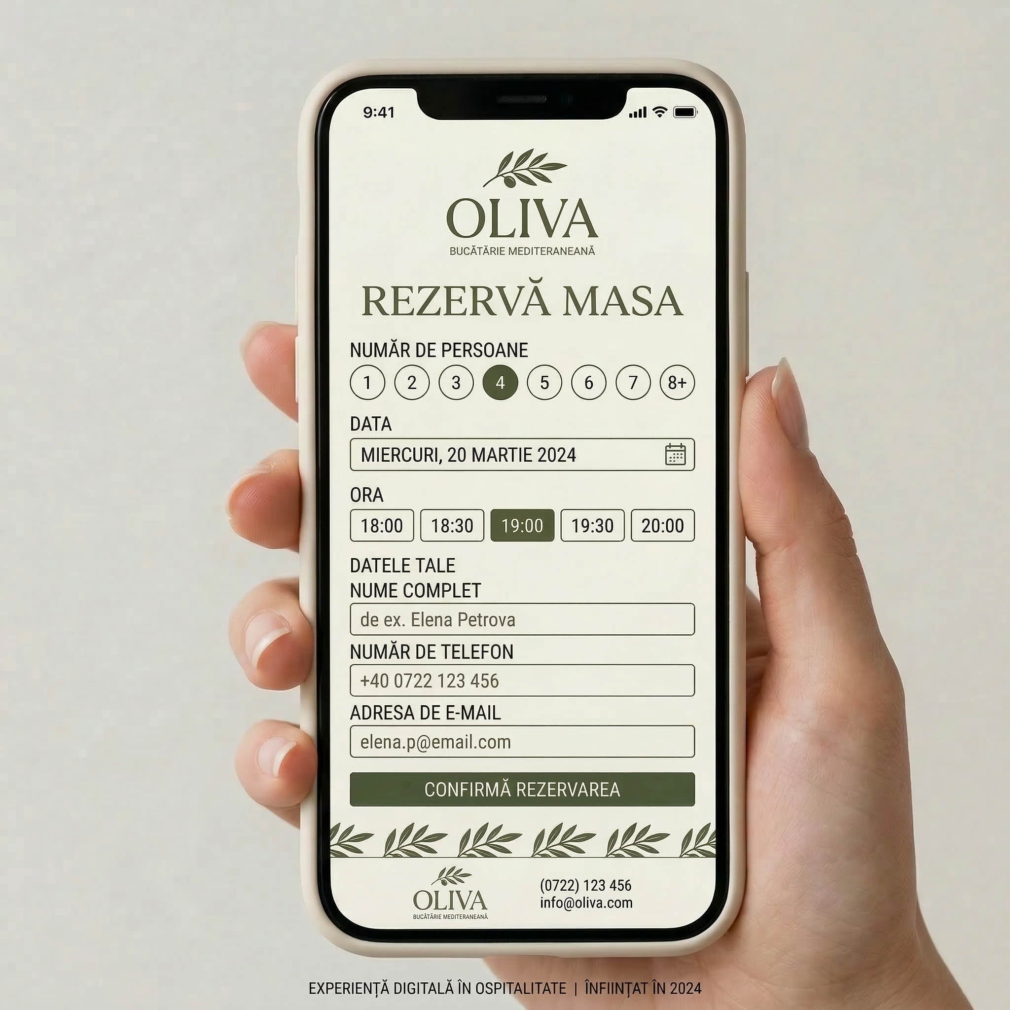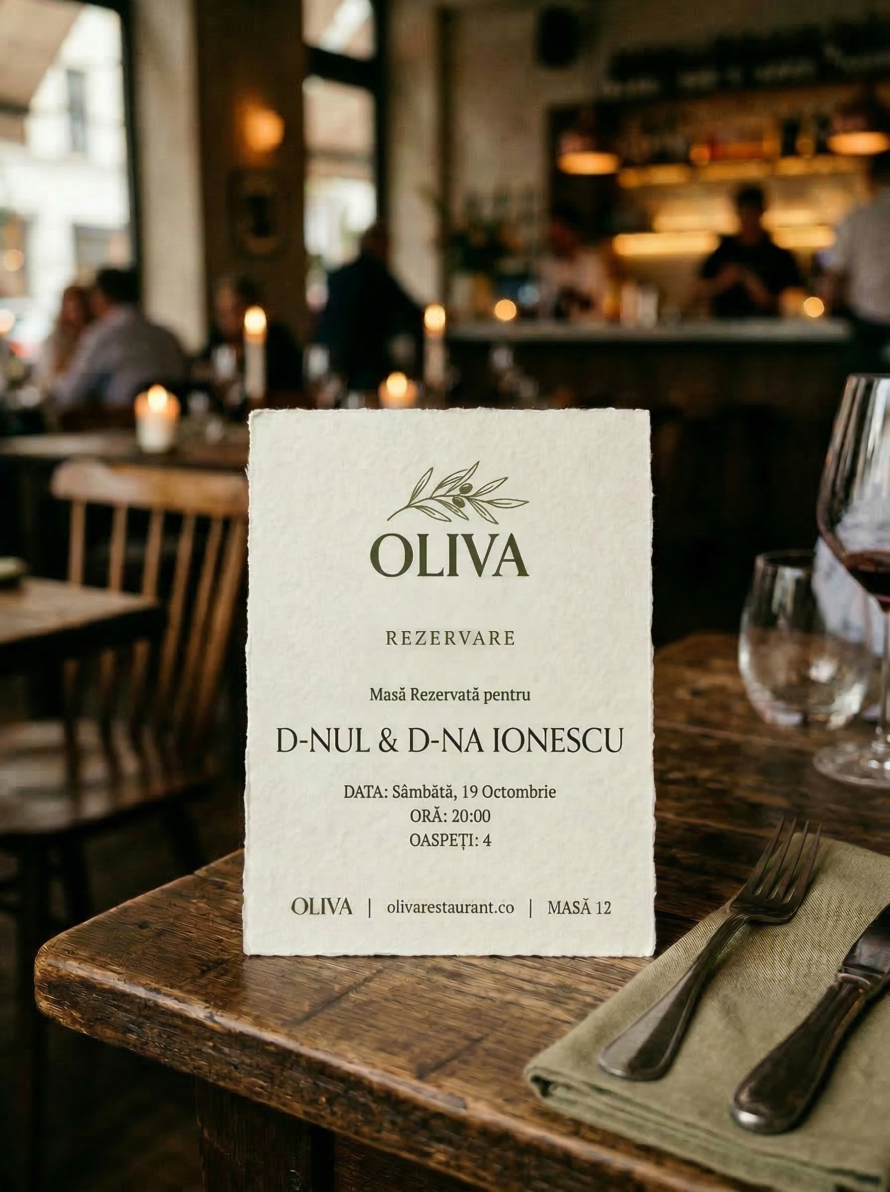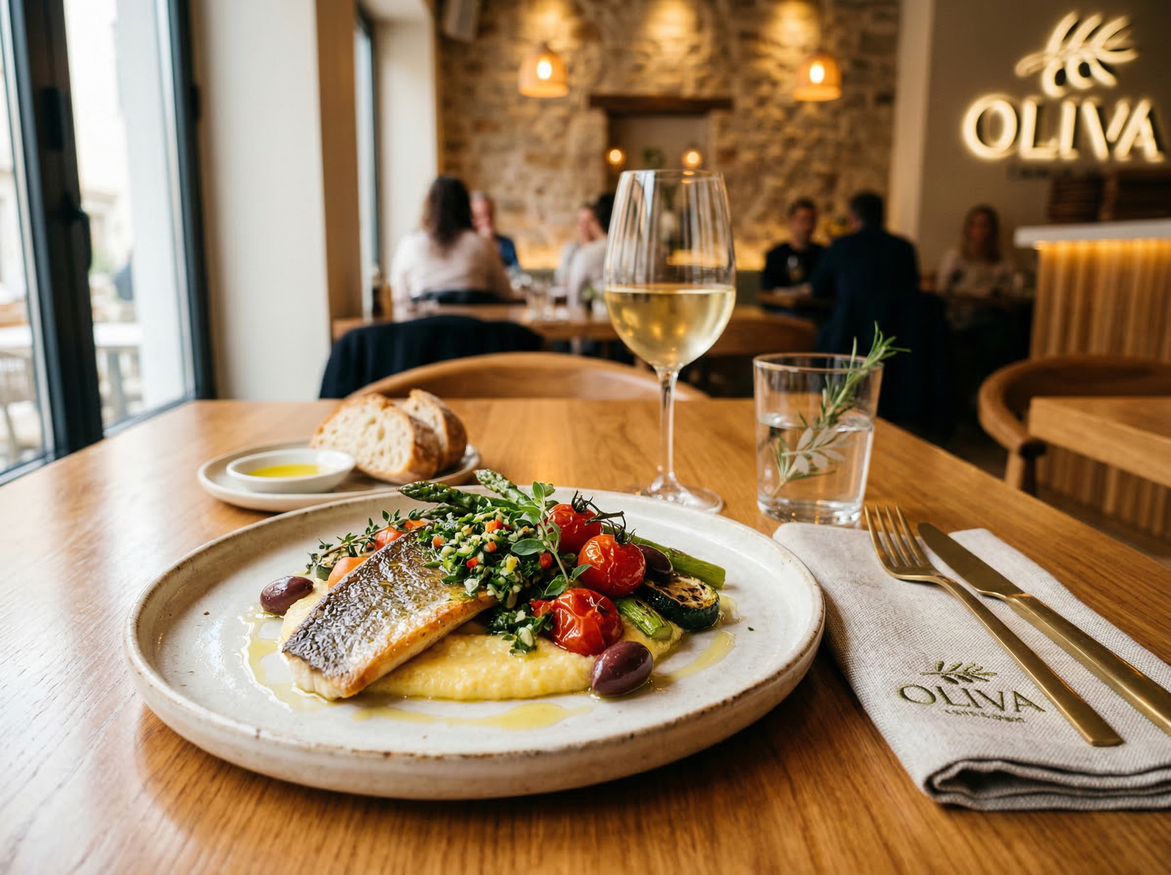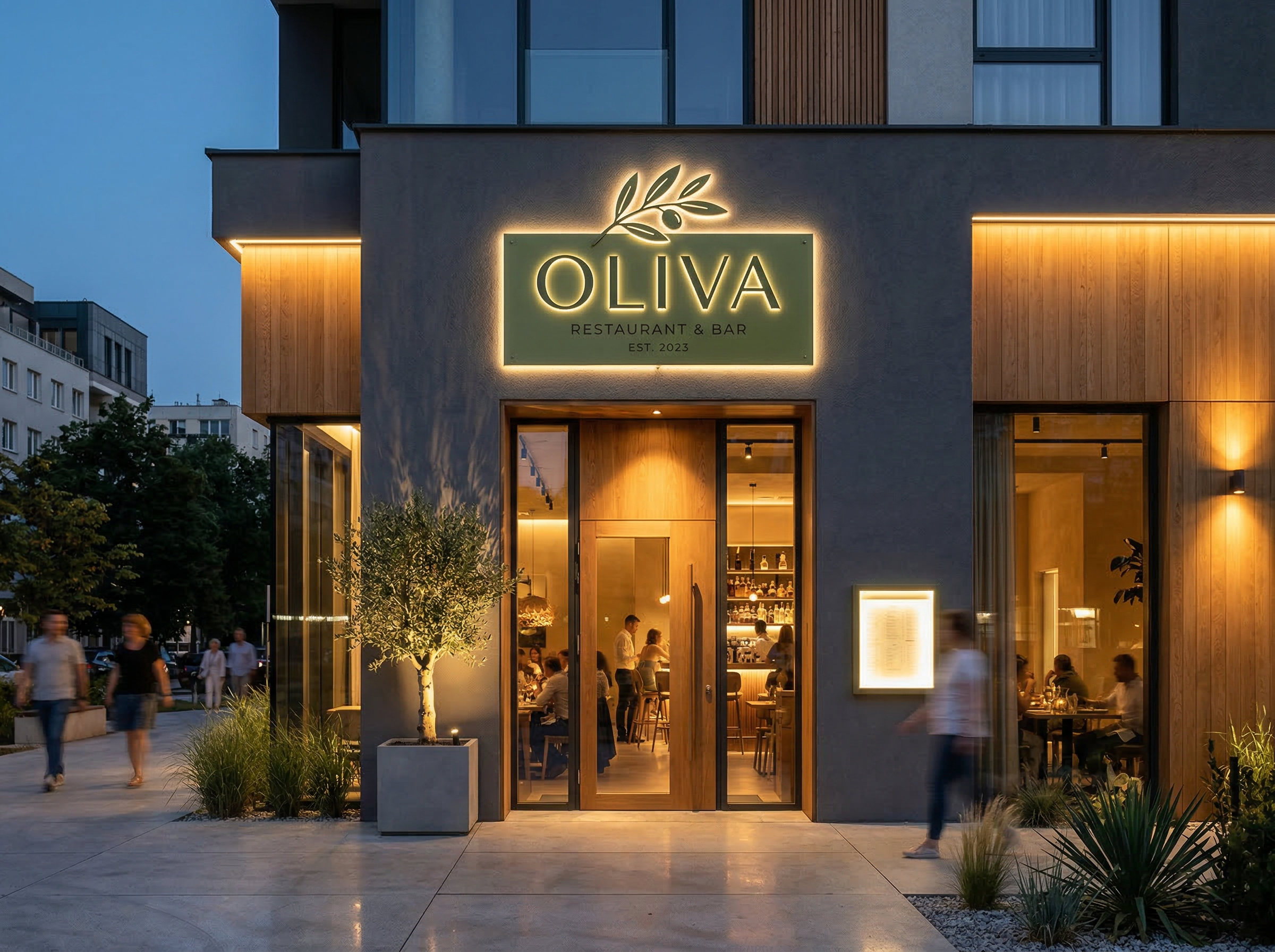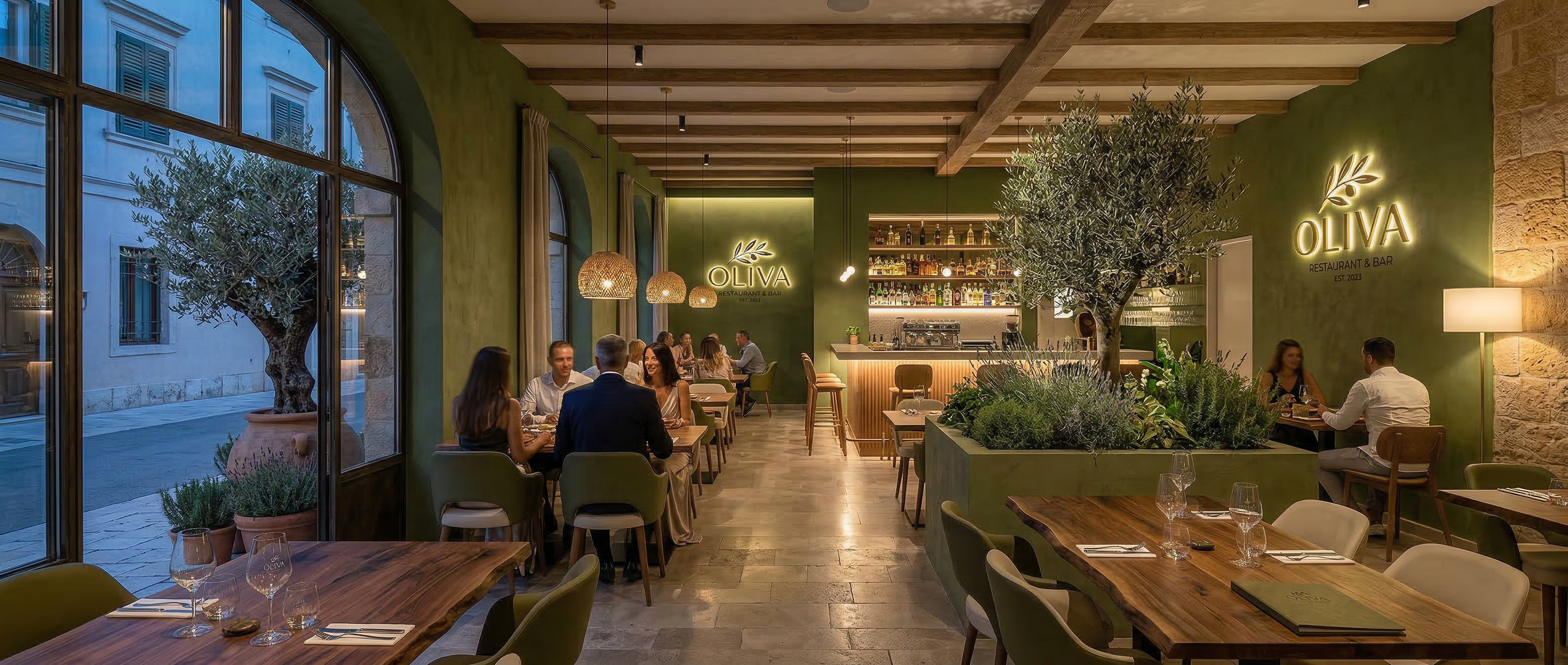 Identitatea Oliva se traduce natural în spațiul restaurantului.