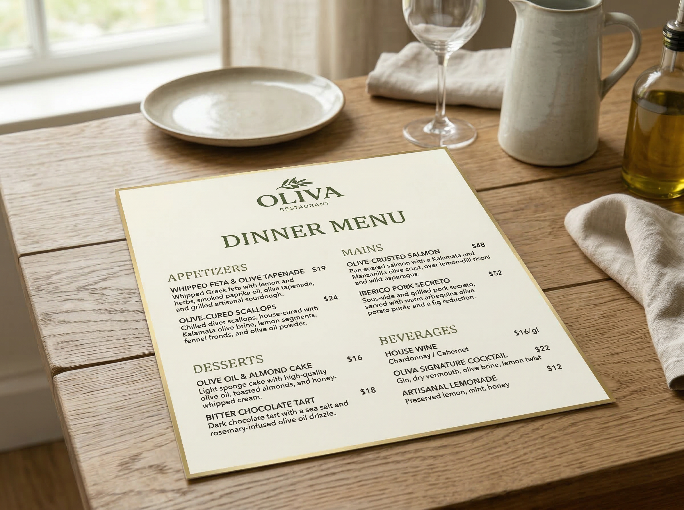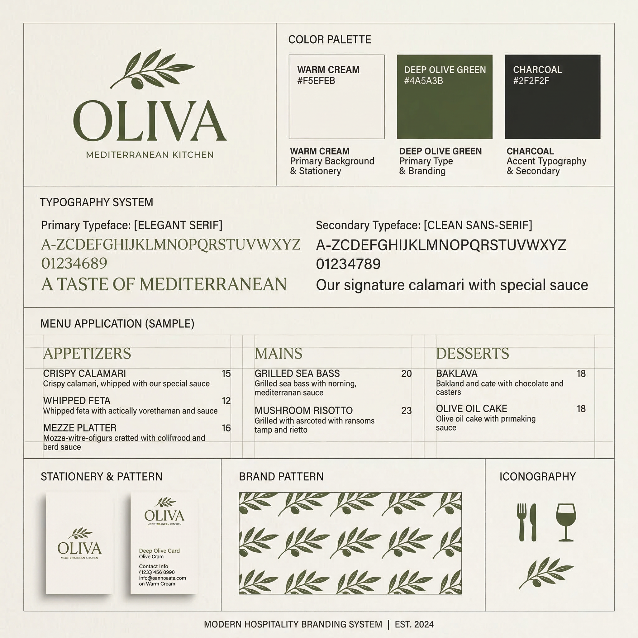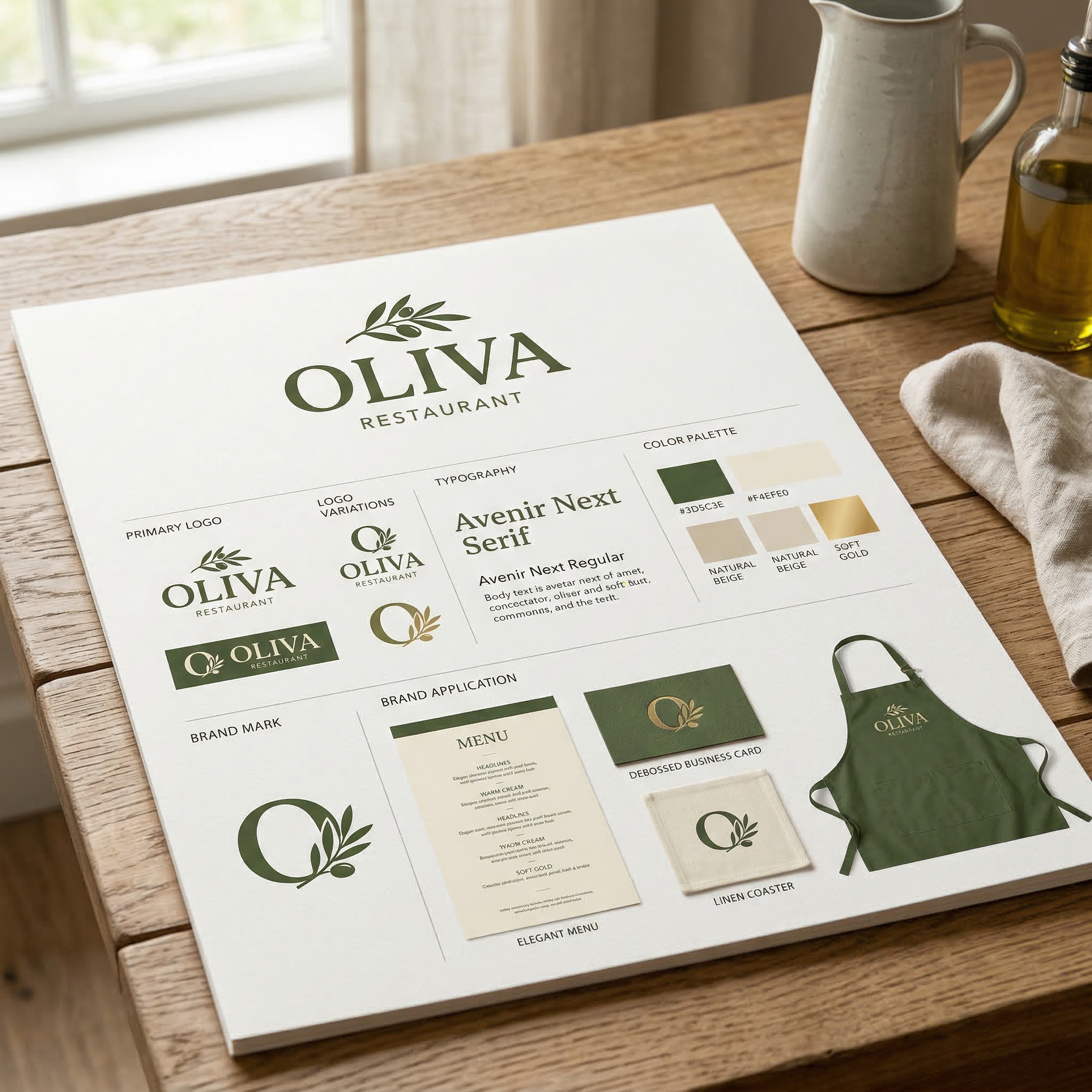 Oliva este un concept de brand pentru un restaurant mediteranean contemporan, construit în jurul ideii de simplitate, prospețime și experiență culinară autentică. Identitatea vizuală combină căldura materialelor naturale cu un limbaj grafic curat și modern.
