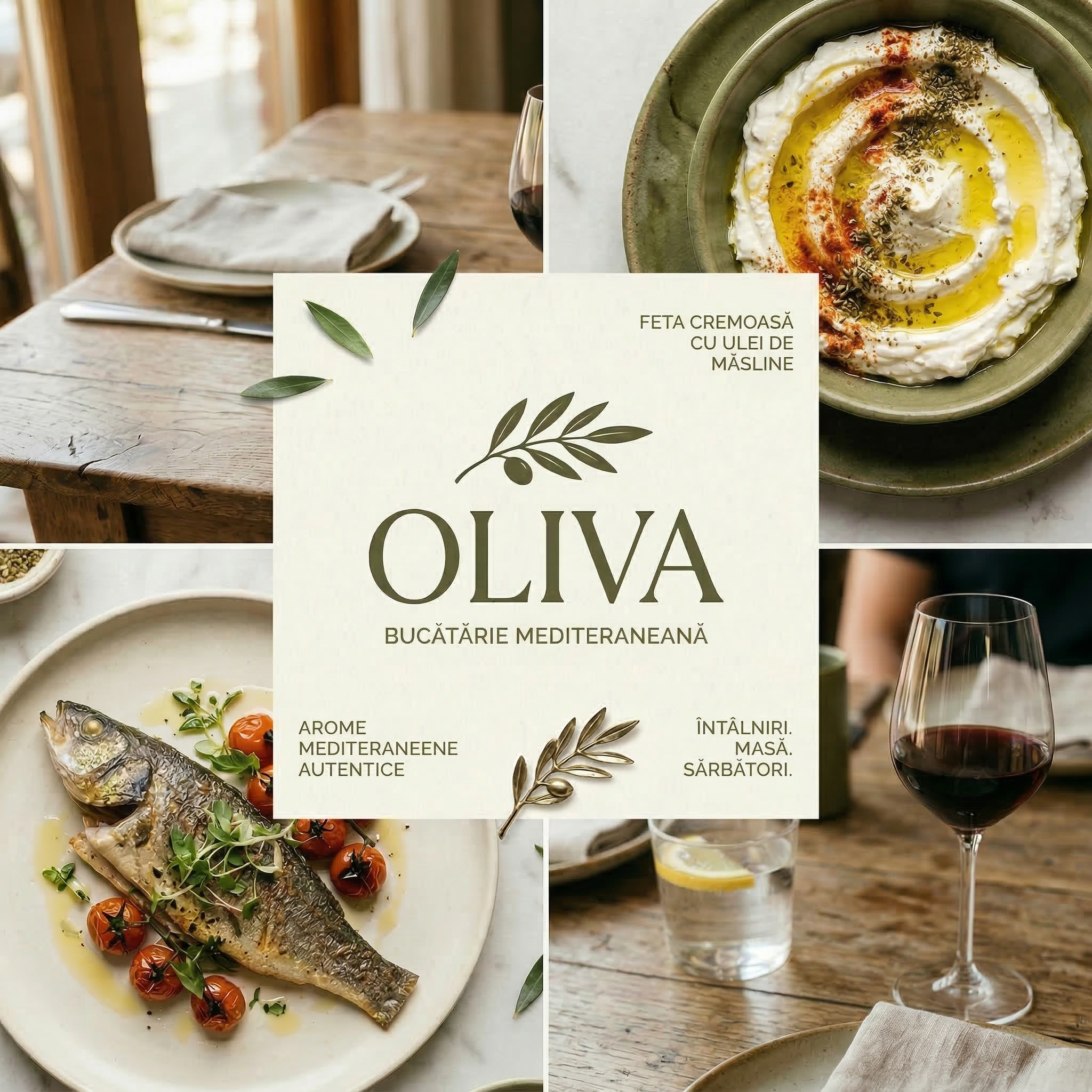Identitatea vizuală porneşte de la un simbol inspirat de măslinul mediteranean — organic, simplu şi recognoscibil.